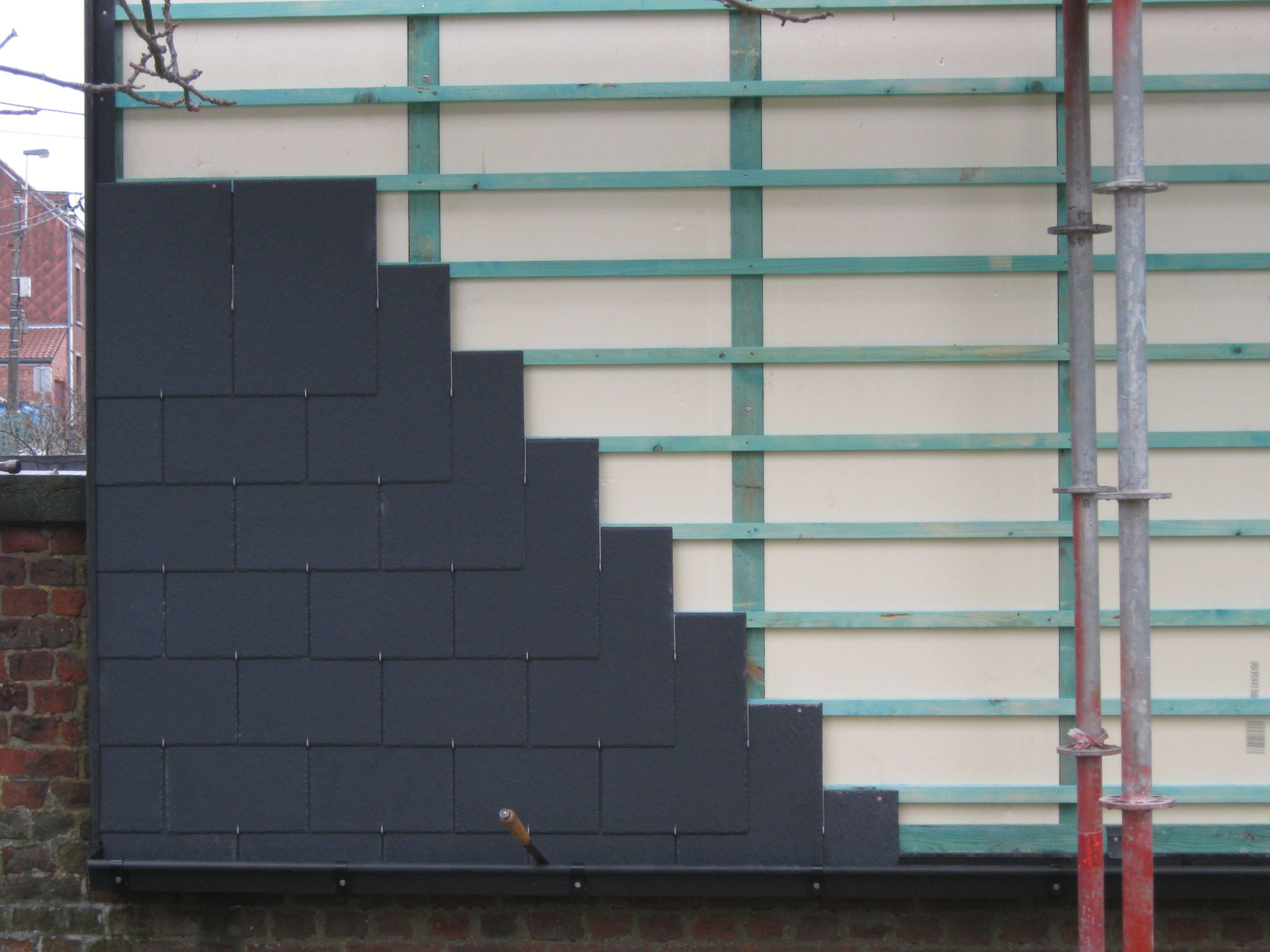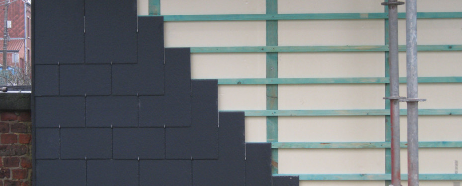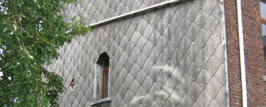 Ancien revêtement de bardage à remplacer par un isolant et une nouvelle ardoise.